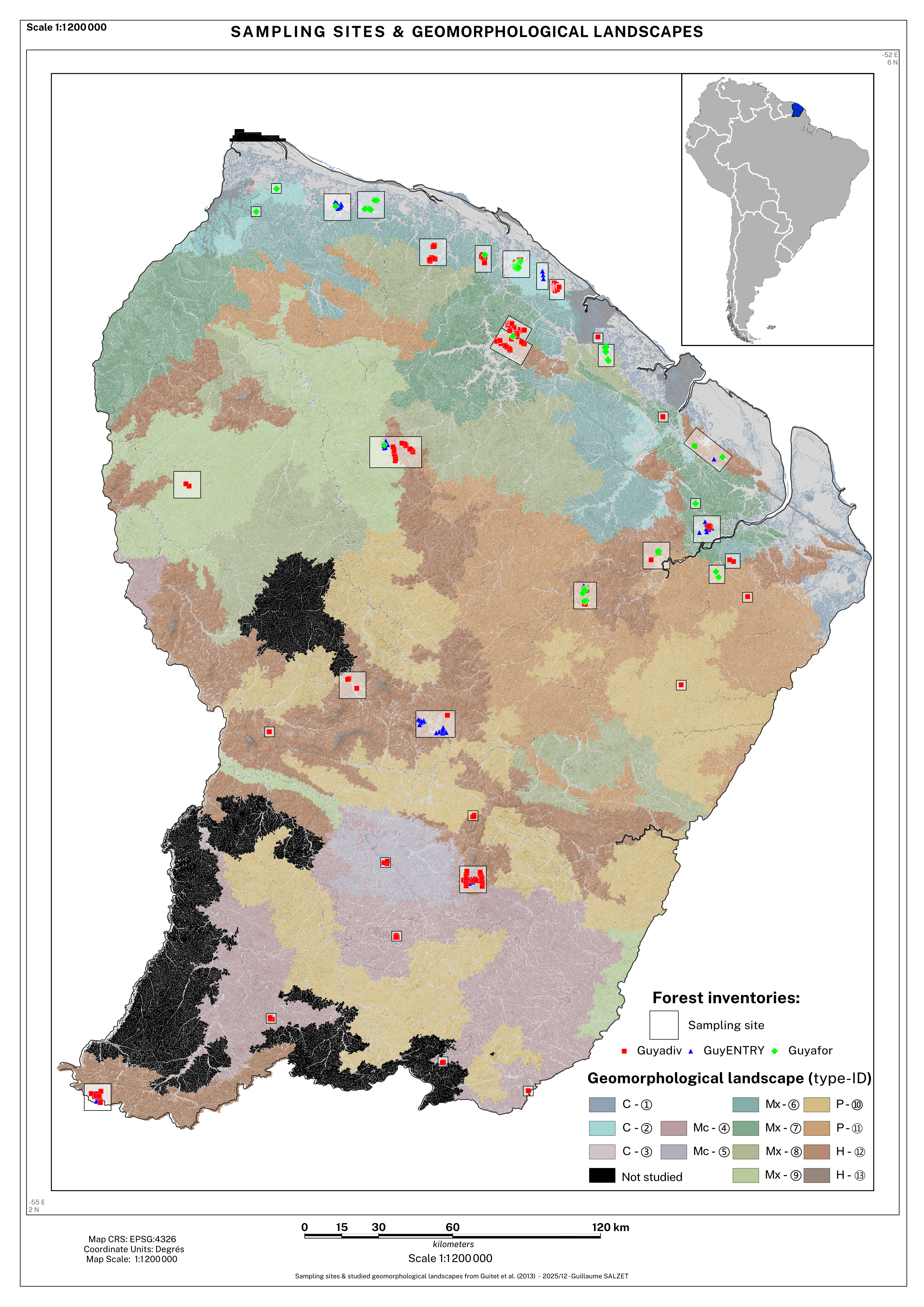 Figure 1: Locations of forest inventory plots across geomorphological landscapes of French Guiana.