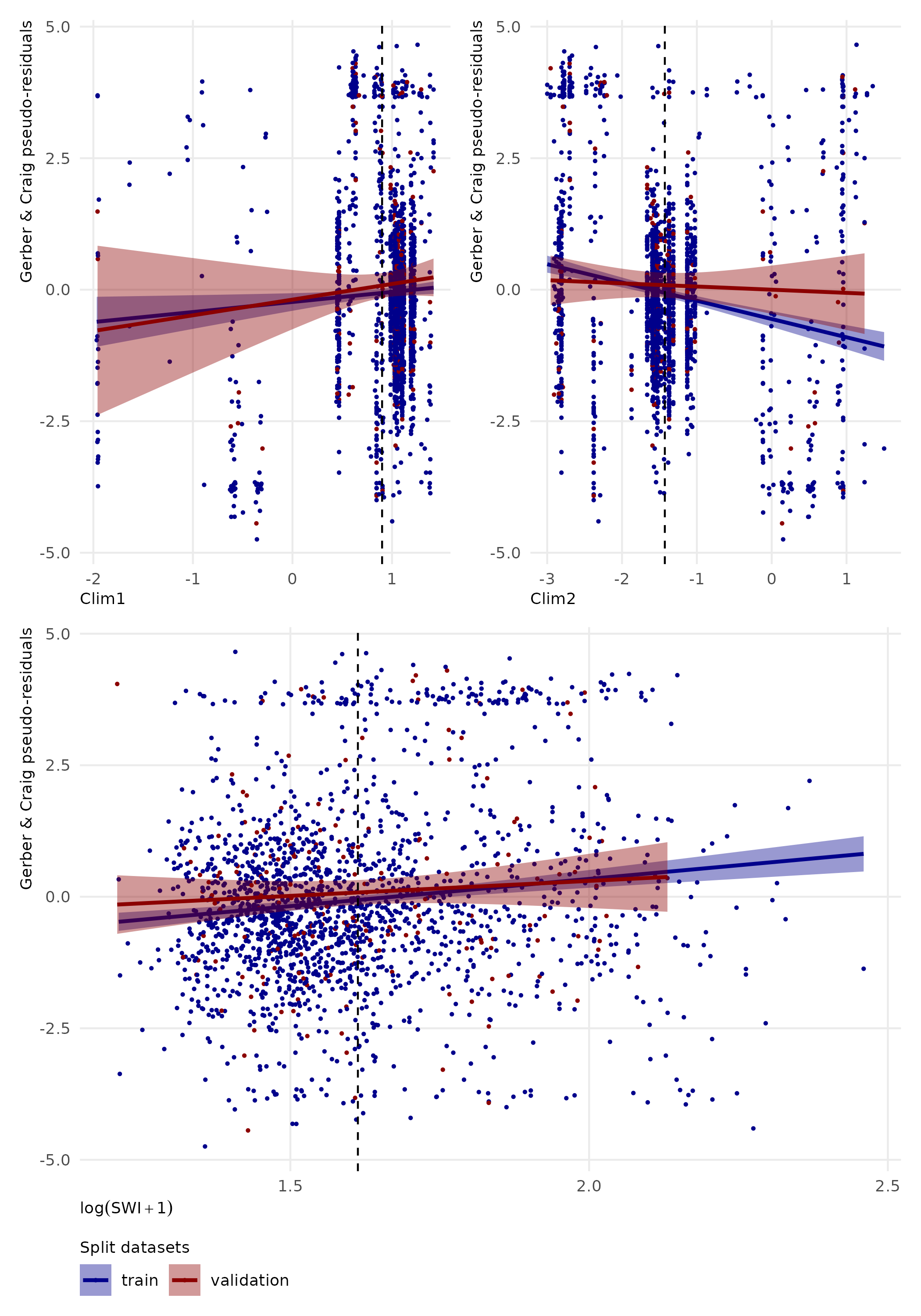 Analysis of the pseudo-residuals Figure 5 shows an unbiased zero-centred distribution for quantitative variables \(Clim_1\), \(Clim_2\) and \(SWI\) in validation dataset.
