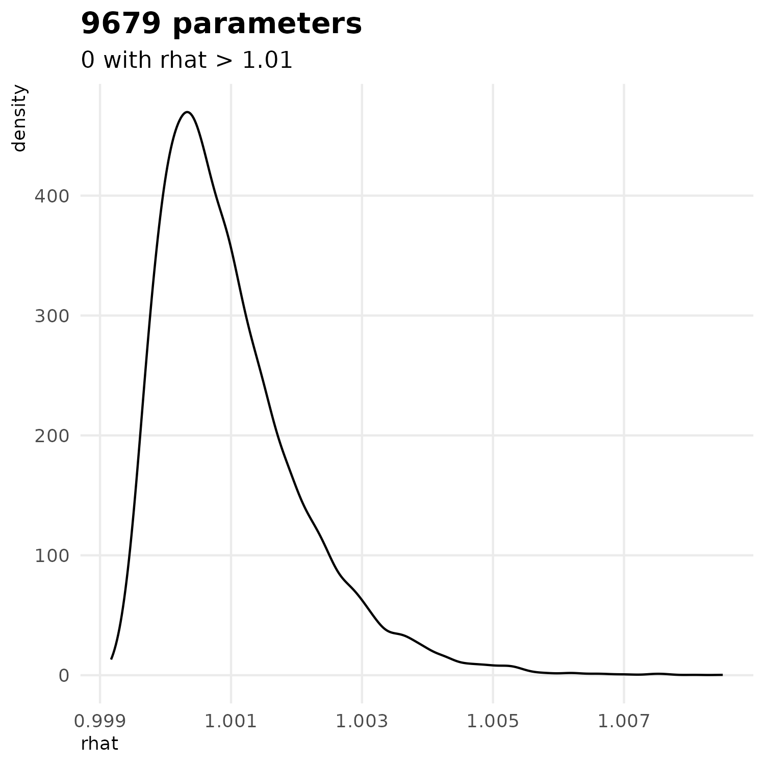 ---title: "Model diagnostics"format: html: code-fold: true---```{r libraries-data, warning=FALSE, message=FALSE, include=FALSE}library(tidyverse)library(rstan)library(brms)library(gt)library(gtExtras)here_rel <- function(...) { fs::path_rel(here::here(...))}source(here_rel("R", "funs_graphics.R"))source(here_rel("R", "funs_plot_tables.R"))source(here_rel("R", "funs_model.R"))theme_set(theme_public())```# Model fittingIn the model $H0$, we infered 1 parameter ($\phi$).In the model $H_1$ We estimated the 9,679 parameters with a Bayesian inference method using the Stan language @carpenterStanProbabilisticProgramming2017 and the R package cmdstanr @gabryCmdstanrInterfaceCmdStan2025. The posterior distribution evaluation consisted of a preliminary warm-up phase using a Laplace approximation algorithm (10,000 iterations) followed by estimation with a No U-Turn Sampler including 2,000 warm-up iterations and 2,000 sampling iterations.```{r}path_fitH0 <-here_rel("results", "models", "H0")fitH0_chains <- brms::read_csv_as_stanfit(paste0( path_fitH0, "/",list.files(path_fitH0, "*.csv")))fitH0 <-readRDS(here_rel("results", "models", "H0", "fitH0.rds"))path_fitH1 <-here_rel("results", "models", "H1")fitH1_chains <- brms::read_csv_as_stanfit(paste0( path_fitH1, "/",list.files(path_fitH1, "*.csv")))fitH1 <-readRDS(here_rel("results", "models", "H1", "fitH1.rds"))```# Model diagnostics## ConvergenceConvergence was verified using the $\hat R$ statistic.```{r}#| label: fig-rhat#| fig-align: center#| fig-cap: "Distribution of convergence metrics (R hat) for model H1"if (!file.exists(here_rel("notebook", "figs","rhat_H1.png"))) {if (file.exists(here_rel("results", "models", "H1", "Summary_H1.rds"))) { RhatH1 <-readRDS(here_rel("results", "models", "H1", "Summary_H1.rds"))$rhat } else { summaryH1 <- fitH1$summary()saveRDS(summaryH1,here_rel("results", "models", "H1", "Summary_H1.rds")) RhatH1 <- summaryH1$rhatnames(RhatH1) <- summaryH1$variable } g <- RhatH1 |>as_tibble() |>mutate(par =names(RhatH1)) |>rename(rhat = value) |>ggplot(aes(x = rhat)) +geom_density() +theme_public() +ggtitle("9679 parameters", "0 with rhat > 1.01")ggsave(plot = g, filename =here_rel("notebook", "figs","rhat_H1.png"), bg ="white", width =5,height =5)} knitr::include_graphics(here_rel("notebook", "figs","rhat_H1.png"))```The model correctly converged (all $\hat R < 1.01$) for all parameters. For the sake of illustration, we show just five parameters including log-posterior `lp__` and 5 paramaters selected at random.```{r}#| label: fig-traceplot#| fig-align: center#| fig-cap: "Traceplots for log posterior and 4 parameters from model H1"plot_trace( fitH1,c("lp__", sample(variables(fitH1), 5)))```These plots show that the chains are stable, well-mixed, and converged.We performed a NUTS energy diagnostics where we examine the distribution of the sampler’s Hamiltonian “energy” (energy__) across post–warm-up iterations.In Hamiltonian Monte Carlo, the energy reflects the sum of potential energy (linked to the log-posterior) and kinetic energy (from the momentum variables), and its behaviour provides a direct check of whether the sampler is moving efficiently through the posterior.We expect overlapping, unimodal distributions of energy across chains which indicate a consistent exploration of the same posterior geometry.```{r}#| label: fig-NUTS-energy#| fig-align: center#| fig-cap: "NUTS energy diagnostics of model H1"bayesplot::mcmc_nuts_energy(nuts_params(fitH1)) +theme_public()```Across the four NUTS chains, we observe the expected pattern. The centered, approximately symmetric shapes suggest no strong pathology in energy transitions and no obvious chain-specific deviations. Minor differences in tail mass are limited, supporting stable sampling behaviour across chains.## Posterior predictive adequacy (pseudo-residuals)We use the pseudo-residual approach implemented in `estimate_residuals()` following to Gerber & Craig method @gerberResidualsDiagnosticsMultinomial2024.```{r}if (!all(file.exists(here_rel("results", "models", "H0", "Y_H0_fitted.rds"),here_rel("results", "models", "H1", "Y_H1_fitted.rds")))) {if (!file.exists(here_rel("data", "raw_data", "Y_raw.rds"))) {stop(paste0("missing ", here_rel("data", "raw_data", "Y_raw.rds"))) } else { Y_raw <-readRDS(here_rel("data", "raw_data", "Y_raw.rds")) Y_fitted_H0 <-estimate_residuals(fitH0, Y_raw |>filter(type =="train"), Y_raw |>filter(type =="validation"),chunk_size =100, ncores =1 )saveRDS(Y_fitted_H0, here_rel("results", "models", "H0", "Y_H0_fitted.rds")) Y_fitted_H1 <-estimate_residuals(fitH1, Y_raw |>filter(type =="train"), Y_raw |>filter(type =="validation"),chunk_size =100, ncores =1 )saveRDS(Y_fitted_H1, here_rel("results", "models", "H1", "Y_H1_fitted.rds")) }}Y_fitted_H0 <-readRDS(here_rel("results", "models", "H0", "Y_H0_fitted.rds"))Y_fitted_H1 <-readRDS(here_rel("results", "models", "H1", "Y_H1_fitted.rds"))```Gerber & Craig pseudo-residuals for multinomial count models that are constructed to behave like standard normal residuals when the fitted model is correct. For each observation (count vector) : * (i) generate many replicate count vectors from the fitted multinomial model, * (ii) map observed and simulated compositions to using an additive log-ratio (log-odds) transform, after applying a correction that removes zeros (so log-ratios are defined), * (iii) quantify how unusual the observed log-odds vector is relative to its model-based sampling distribution using a squared Mahalanobis distance (which accounts for covariance among categories), * (iv) convert the observed distance into a randomised percentile under the empirical distance distribution, then apply a probit transform to obtain a single residual per observation.Under correct specification, these residuals are approximately (and, aside from parameter-estimation uncertainty, conceptually) standard normal, enabling familiar residual-vs-covariate plots to diagnose general lack of fit in multinomial.```{r}#|