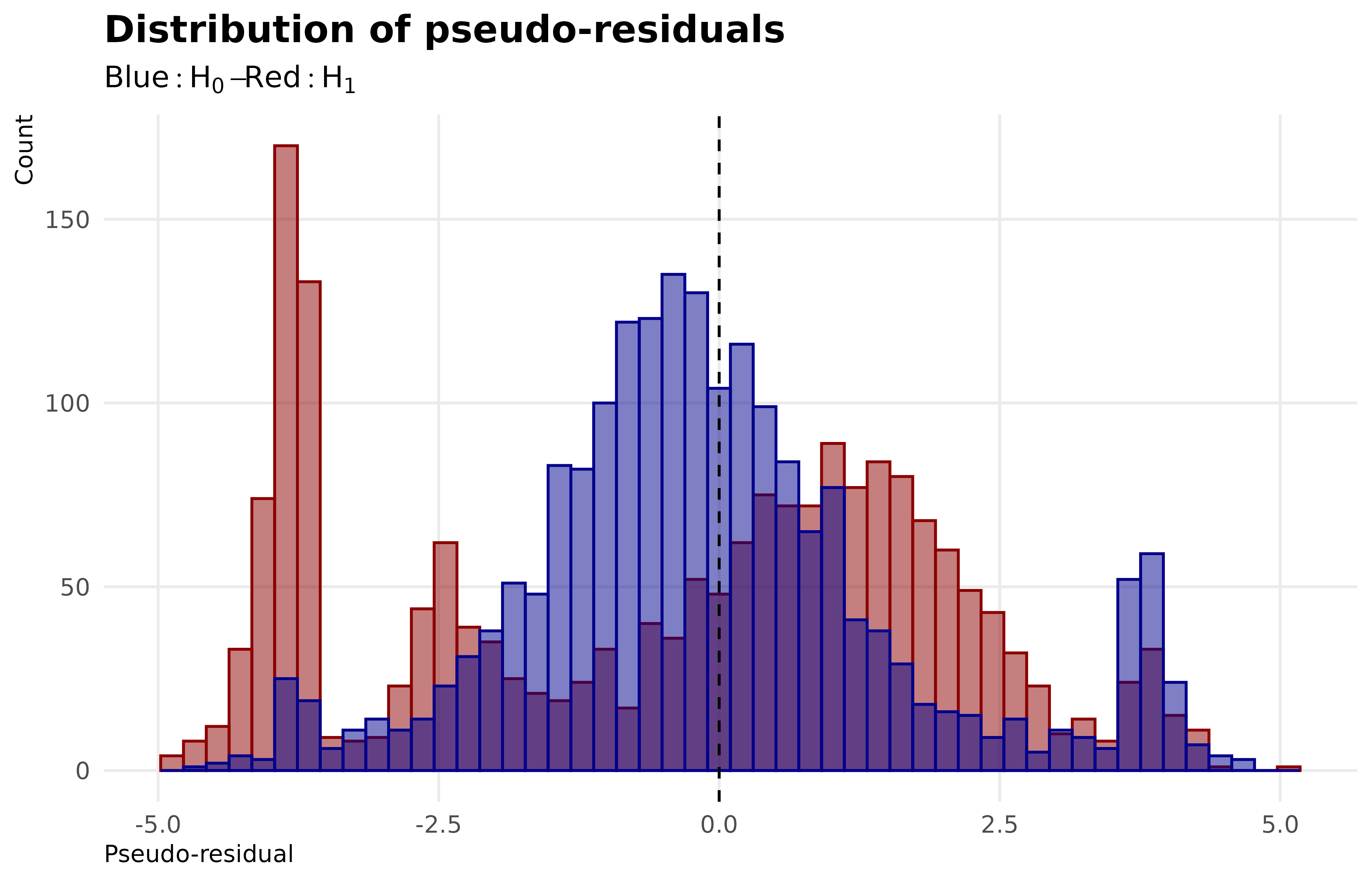 tibble(res_H0 = Y_fitted_H0$res, res_H1 = Y_fitted_H1$res) |>ggplot() +geom_histogram(aes(x = res_H0), fill ="darkred", color ="darkred", bins =50, alpha =0.5) +geom_histogram(aes(x = res_H1), fill ="darkblue", color ="darkblue", bins =50, alpha =0.5) +geom_vline(xintercept =0, linetype ="dashed") +labs(x ="Pseudo-residual", y ="Count", title ="Distribution of pseudo-residuals", subtitle =expression(Blue: H[0]- Red: H[1]))+theme_public()