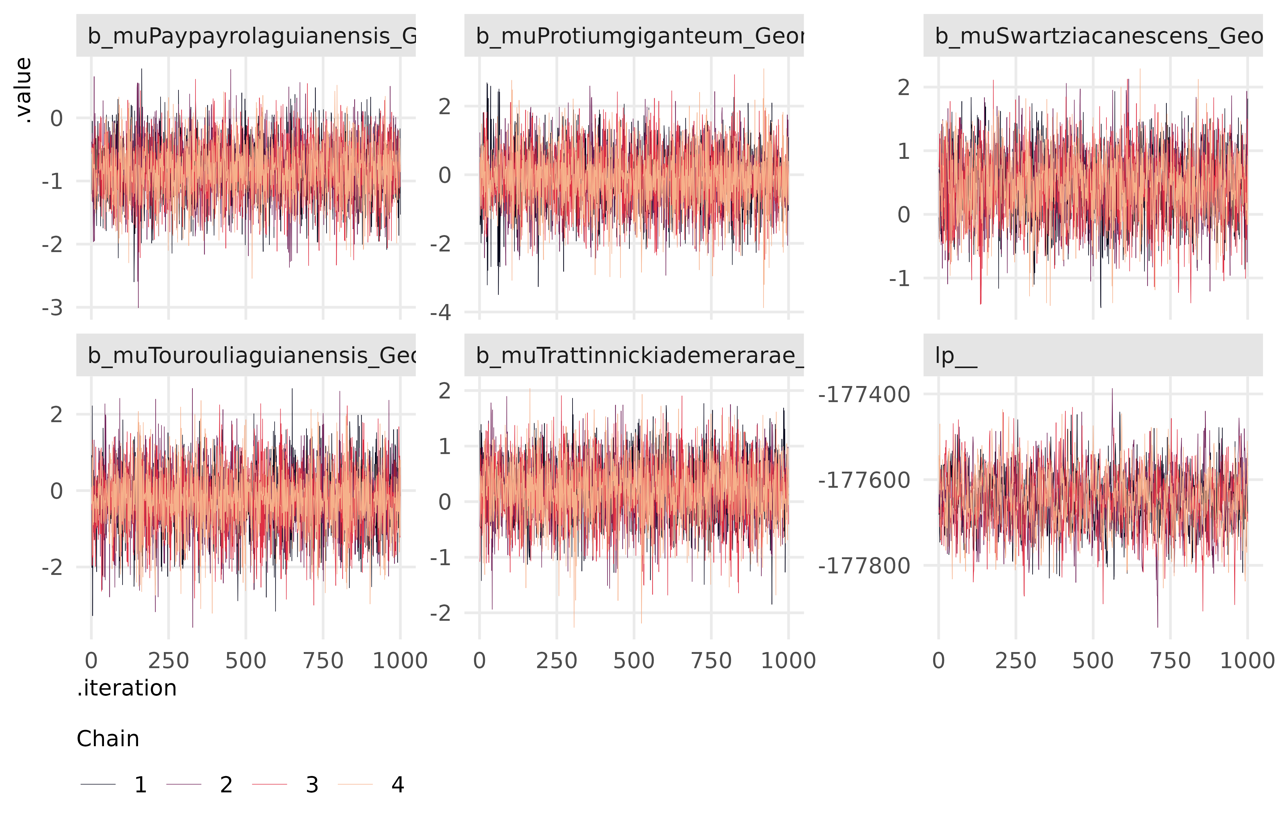 These plots show that the chains are stable, well-mixed, and converged.