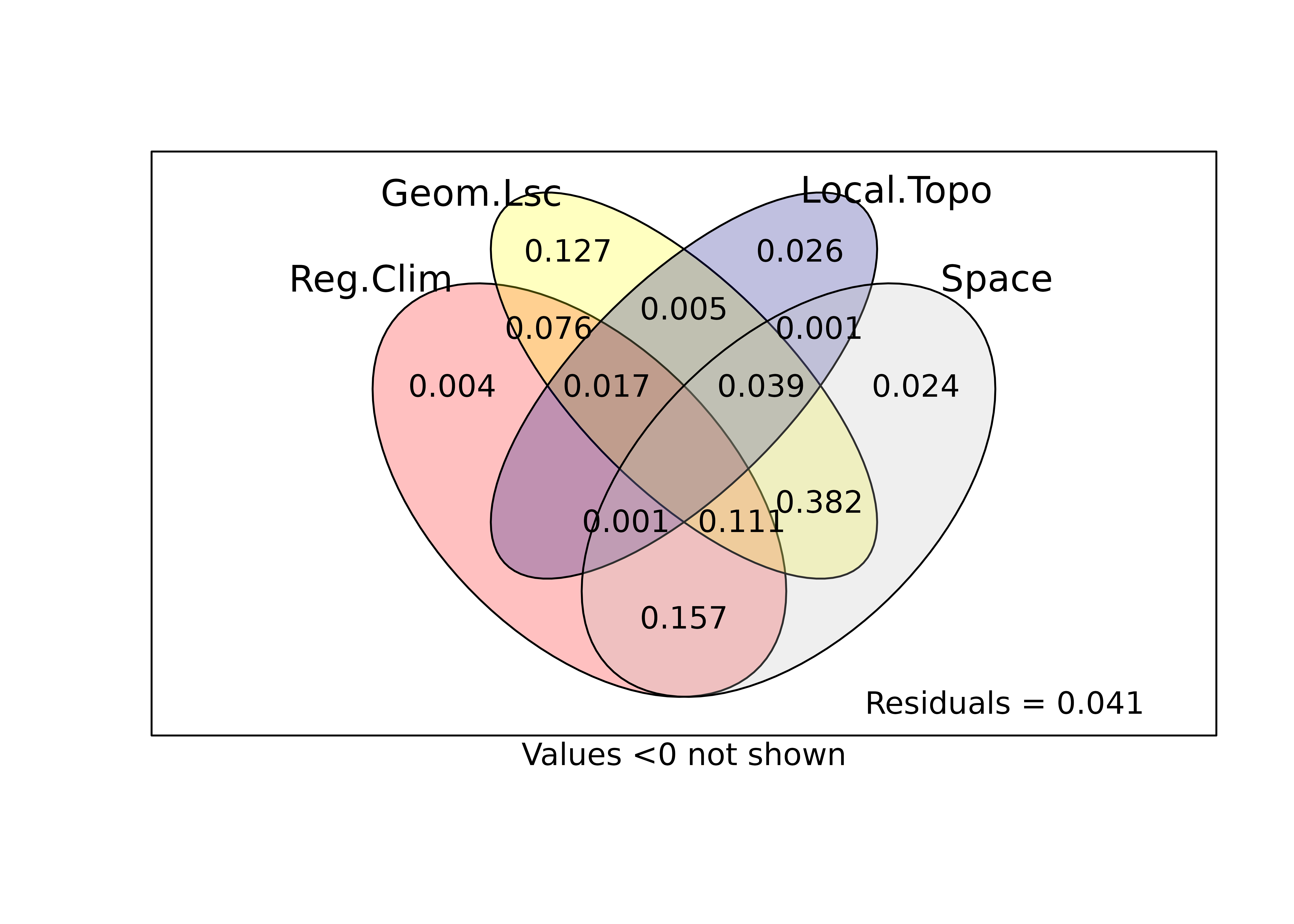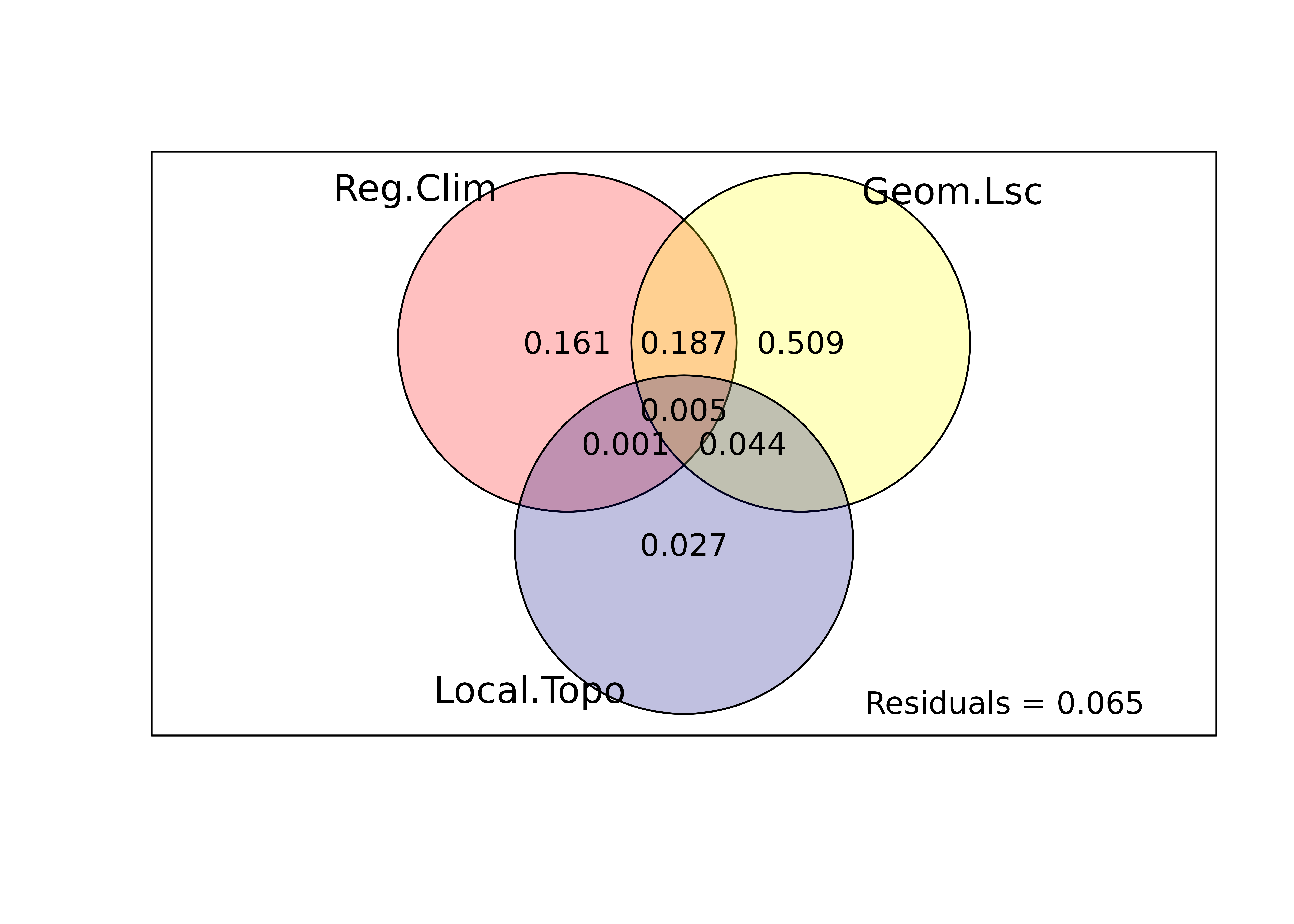 When adding space reduces the pure environmental fractions, the difference indicates that part of the apparent environmental signal is spatially structured—either because environmental gradients themselves are spatially organised (e.g. regional climate gradients), or because unmeasured spatial processes (dispersal limitation, historical contingencies) co-vary with the measured environment.